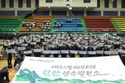 [참좋은뉴스= 기자] 진안군이 26일 오후 진안문예체육회관에서 군민 500여 명과 주요 내빈이 참석한 가운데 ‘진안양수발전소 유치 성공기원 범군민 결의대회’를 성황리에 마무리하고, 유치 성공에 대한 강력한 의지를 대내외에 선포했다. 이날 결의대회에는 전춘성 진안군수를 비롯해 김관영 전북특별자치도지사, 안호영 국회의원, 동창옥 진안군의회 의장, 그리고 한국동서발전 권명호 사장 등이 참석하여 진안의 도약에 힘을 실었다. 먼저 성공기원공연으로 준비된 붓글씨 공연(캘리그라피)에서는 ‘새로운 시작, 100년 미래 진안양수발전소’라는 문구를 역동적인 붓놀림으로 그리며 진안의 강력한 의지를 예술적으로 승화시켜 참석자들의 큰 박수를 받았다. 이어 진행된 구동수 위원장과 신갑수 위원장의 결의문 낭독 직후 두 위원장의 선창에 맞춰 500여 군민이 하나 된 목소리로 일제히 손 피켓 펼치기 퍼포먼스가 진행돼 군민의 하나 된 힘으로 양수발전소를 진안에 유치하겠다는 결의를 다졌다. 특히, 마지막 유치 성공 다짐 퍼포먼스는 참석자들의 마음을 하나로 모았다. 군민과 주요 내빈들이 행사 시작 전 대형애드벌룬에 남긴