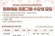 [참좋은뉴스= 기자] 충북 괴산군청소년문화의집이 청소년들의 창의적 역량과 전인적 성장을 지원하기 위한 ‘2026년 문화예술 프로그램’ 수강생을 모집한다고 20일 밝혔다. 이번 프로그램은 청소년들이 문화·예술·체육·학습 분야의 다양한 활동을 경험하며 자기표현 능력과 정서적 안정, 건강한 여가문화를 형성할 수 있도록 기획됐다. 강좌는 예술, 체육, 학습 분야 등 총 10개 과정으로 구성됐다. 세부 프로그램으로는 △드럼 △바이올린 △발레 △댄스 등 예술 강좌와 △요리 △포켓볼 △탁구 등 체험·체육 강좌, 그리고 △생명과학 △주산 △기초학습&보드게임 등으로 구성돼 청소년들의 선택 폭을 넓혔다. 특히 ‘기초학습&보드게임’ 프로그램은 대청교(대학생 청소년 교육 멘토링)와 함께 운영된다. 국어·수학·영어 등 교과 중심 학습지도와 보드게임을 병행하고 정서 멘토링 활동도 함께 진행해 학습 흥미와 자신감을 높일 계획이다. 수강 신청은 오는 21일부터 3월 6일까지며 괴산군청소년문화의집 홈페이지를 통해 선착순으로 진행된다. 박은순 가족행복과장은 “이번 문화예술 프로그램을 통해 청