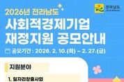 [참좋은뉴스= 기자] 전라남도는 오는 27일까지 사회적경제기업의 지속적이고 안정적인 성장과 자립을 지원하기 위한 2026년 사회적경제기업 재정지원사업 공모를 추진한다. 이번 공모는 ▲일자리창출 지원 ▲사업개발비 지원 ▲시설장비 지원 ▲시군 지역 특화사업 지원, 4개 분야로 나눠 530여 기업에 총 49억 원을 지원할 예정이다. 지난해(27억 원)보다 대폭 확대된 규모다. 특히 올해는 기업 선호도가 높은 인건비에 국비 지원이 재개되고, 도 자체 지원도 확대해 기업의 고용 부담을 완화하고 안정적 일자리 창출을 적극 지원할 방침이다. 일자리창출사업은 진입 초기 사회적기업을 대상으로 취약계층 고용 1명당 월 50만~90만 원을 최대 3년간 인건비로 지원하며, 도 자체 지원사업인 전남형 일자리창출사업은 일반인력과 전문인력까지 추가로 지원한다. 사업개발비 사업은 사회적경제기업의 제품 품질개선, 디자인과 시제품 제작, 홍보비 등 최대 1억 원을 지원한다. 시설장비 사업은 기업이 신규 시설장비를 구입하거나 노후 시설장비 교체 시 최대 2천만 원을 지원한다. 이외에도 시군 실