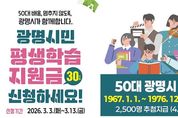 [참좋은뉴스= 기자] 광명시가 50대 중장년 시민의 배움 기본권 보장을 위해 올해도 평생학습지원금 지원을 이어간다. 시는 오는 3월 3일부터 13일까지 11일간 ‘2026년 광명시민 평생학습지원금’ 신청을 받는다고 26일 밝혔다. 광명시민 평생학습지원금은 생애 전환기를 맞은 50대 시민이 나이·소득·배경과 관계없이 배움을 지속할 수 있도록 생애 1회 1인당 30만 원의 평생학습이용포인트를 지원하는 사업이다. 시민 스스로 자신의 삶과 필요에 맞는 학습을 선택하도록 돕는 것이 핵심 목적이다. 박승원 광명시장은 “배움은 선택이 아닌 누구에게나 보장돼야 할 기본권”이라며 “시민이 나이나 환경의 제약 없이 언제든지 배움을 이어갈 수 있도록 평생학습 기반을 더욱 탄탄히 만들어가겠다”고 밝혔다. 신청 대상은 1967년 1월 1일부터 1976년 12월 31일 사이에 출생한 50대 광명시민이다. 광명시에 1년 이상 계속 거주했거나, 거주기간을 합산해 5년 이상 거주하고 있어야 한다. 시는 총 2천500명을 선정해 지원한다. 59세(1967년생)는 올해가 마지막 지원 대상임을 고려해 우선 선정하고, 1