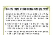 [참좋은뉴스= 기자] 전라남도교육청과 전라남도가 광주·전남 대통합과 교육 대전환을 위한 공동선언문을 발표했다. 김대중 교육감과 김영록 지사는 8일 오전 전남도청에서 만나 최근 논의되고 있는 광주·전남 통합과 관련, “지역 소멸 위기를 넘어 광주·전남 대통합을 주도하고, 대한민국의 새로운 성장축이 될 ‘(가칭) 광주전남 특별시’ 출범이 역사적 사명임을 깊이 공감한다.”며 이같이 선언했다. 전남교육청은 4개 항으로 된 선언문에서 지역 소멸 위기 극복을 위한 광주·전남 대통합에 적극 찬성하며, 통합 특별시의 성공적인 안착을 위해 전남도와 긴밀히 협력하기로 했다. 이어, ‘광주·전남 행정통합 추진협의체’에 핵심 주체로 참여하여, 선진형 초광역 통합모델을 구축하는 데 협력하기로 했다. 또한, 전남교육청은 교육·학예 분야와 관련된 사항에 대해 광주광역시교육청과 함께 법안 작성 및 검토에 앞장서기로 했다. 이와 함께, 전남교육청과 전남도는 통합 과정에서 교육 현장의 목소리를 반영하며, 교육 현장이 체감할 수 있는 교육 대전환과 미래 인재 양성을 위해 모든 역량을 결집한다는 데 합의했다.